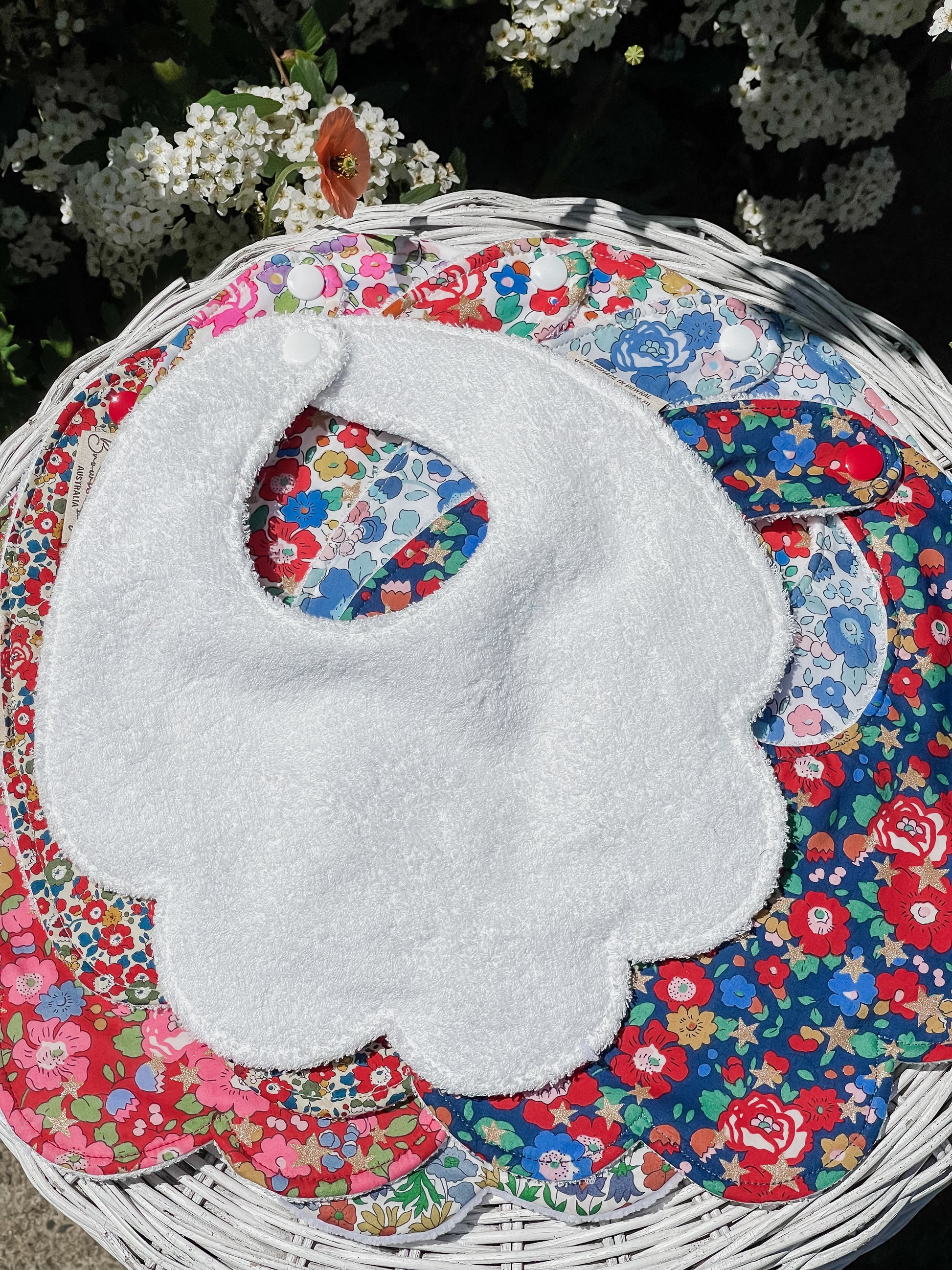 These delightful Liberty bibs are available in two different styles, bandana and scalloped edge. Featuring your choice of Liberty of London Tana Lawn fabrics, backed with soft, thick and absorbent woven bamboo double sided Terry towelling (with optional 3rd waterproof PUL layer).